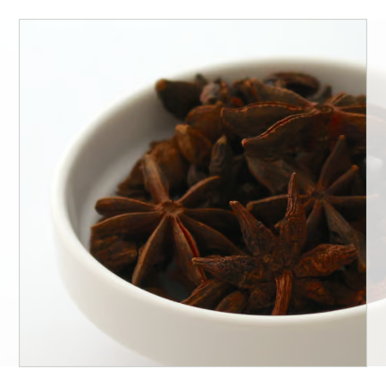 スターアニスは、強く甘い芳香に辛みと苦味を併せた独特の香味をもつスパイスです。噛むと辛辣で軽いシビレと爽やかな味が残ります。日本では八角の名前で知られています。インド、アジア、中国と様々な国の料理で使われており、特に中華料理に欠かせず、豚の角煮や北京ダックに使われているのはよく知られたところです。