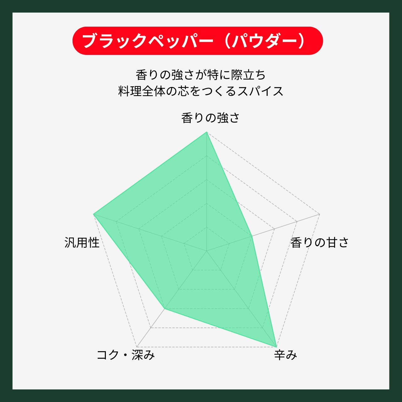 ブラックペッパー(パウダー)は、挽きたての香りが立ち上がり、ホールよりも辛味がはっきりと感じられるのが特徴です。
