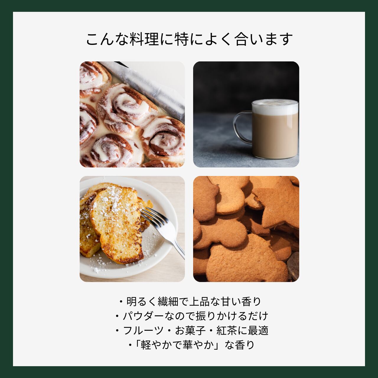 料理・お菓子の甘さや素材の風味をふんわり引き立ててくれるのが特徴です。