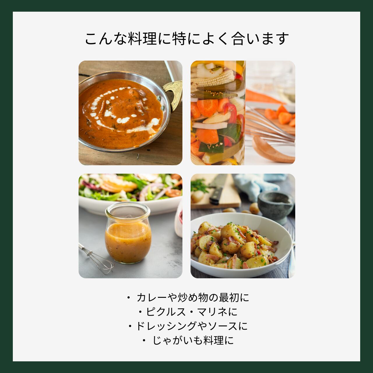 カレーや炒め物はもちろん、ピクルスやマリネ、ドレッシングにも活躍します。