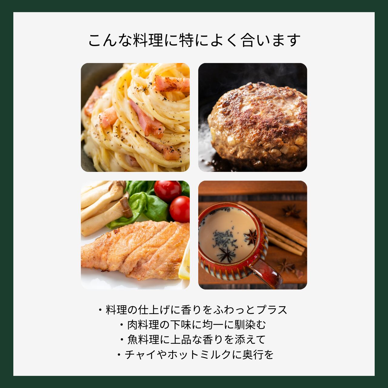 白身魚、サーモン、エビなどの下味や仕上げに。ケーララ産ならではのウッディでほんのり柑橘を思わせる香りが、料理を上品にまとめます。